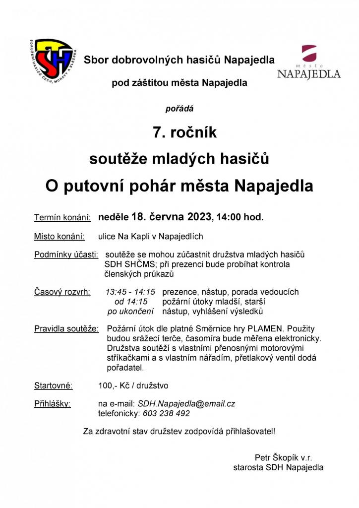V neděli 18. června 2023 od 14:00 hod. se v ulici Na Kapli koná 7. ročník soutěže mladých hasičů O putovní pohár města Napajedla